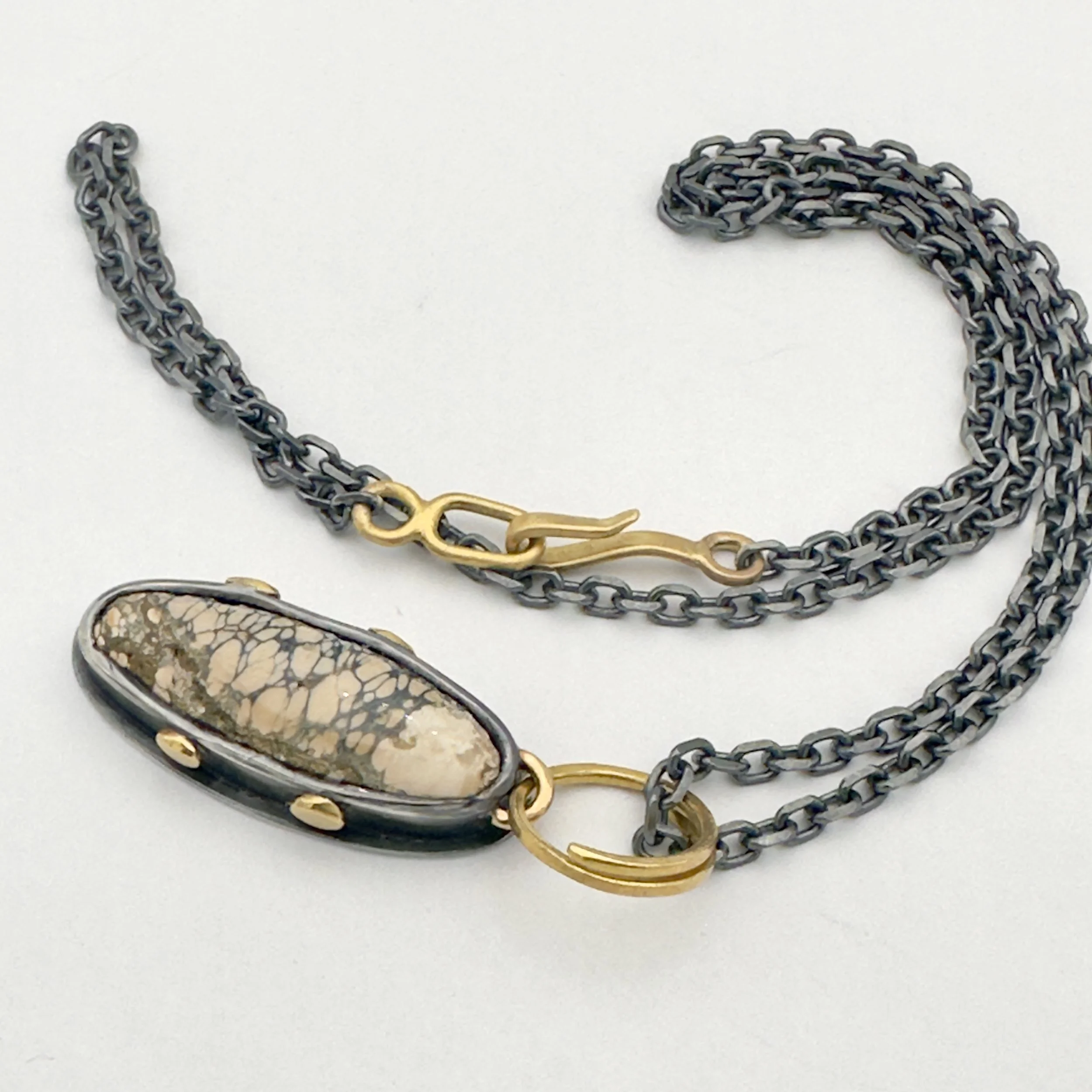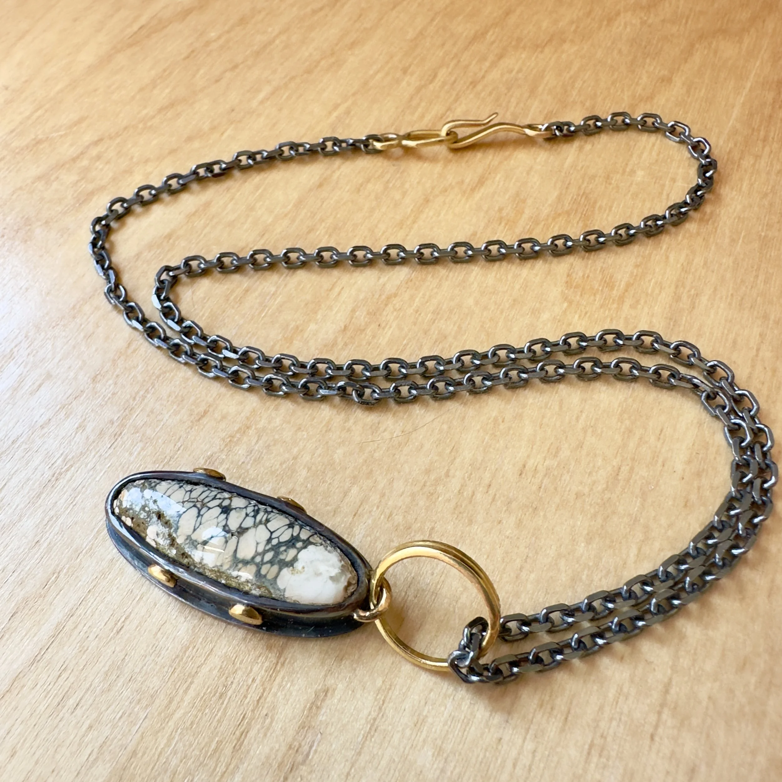 Ivory Creek Variscite comes from Kazakhstan—a rare, quietly beautiful cousin to turquoise, creamy with dramatic black matrix running through it like ink. It’s not common, which is exactly why I’m drawn to it. This one has a slight blush to the cream, and is set in sterling silver patinated to a rich blue-black, with 22k gold rivets and a flexible 22k gold circle bail that pairs with many types of chain. In metaphysical circles, Variscite is the stone of authentic self—encouragement, heart-opening, seeing clearly —and honestly, wearing it, you’ll feel its special earthiness. Some stones find you at exactly the right moment.