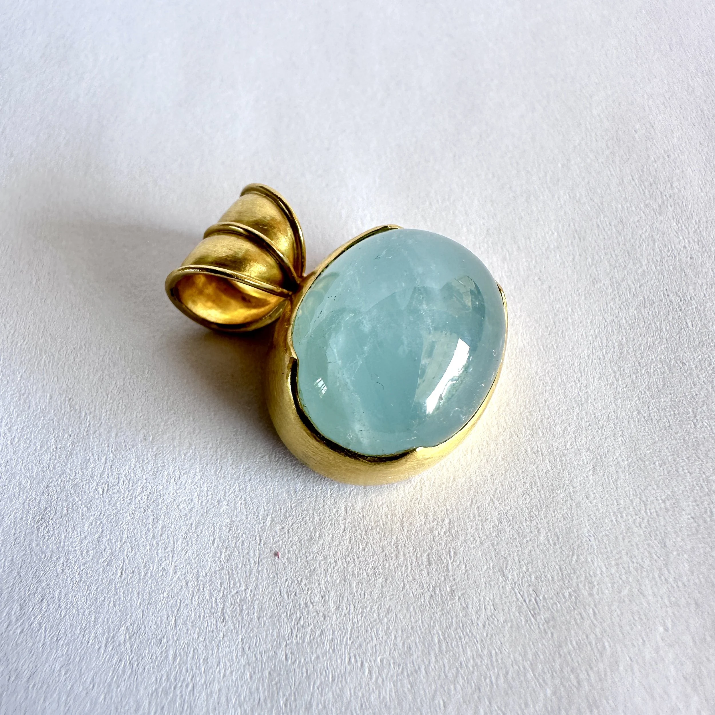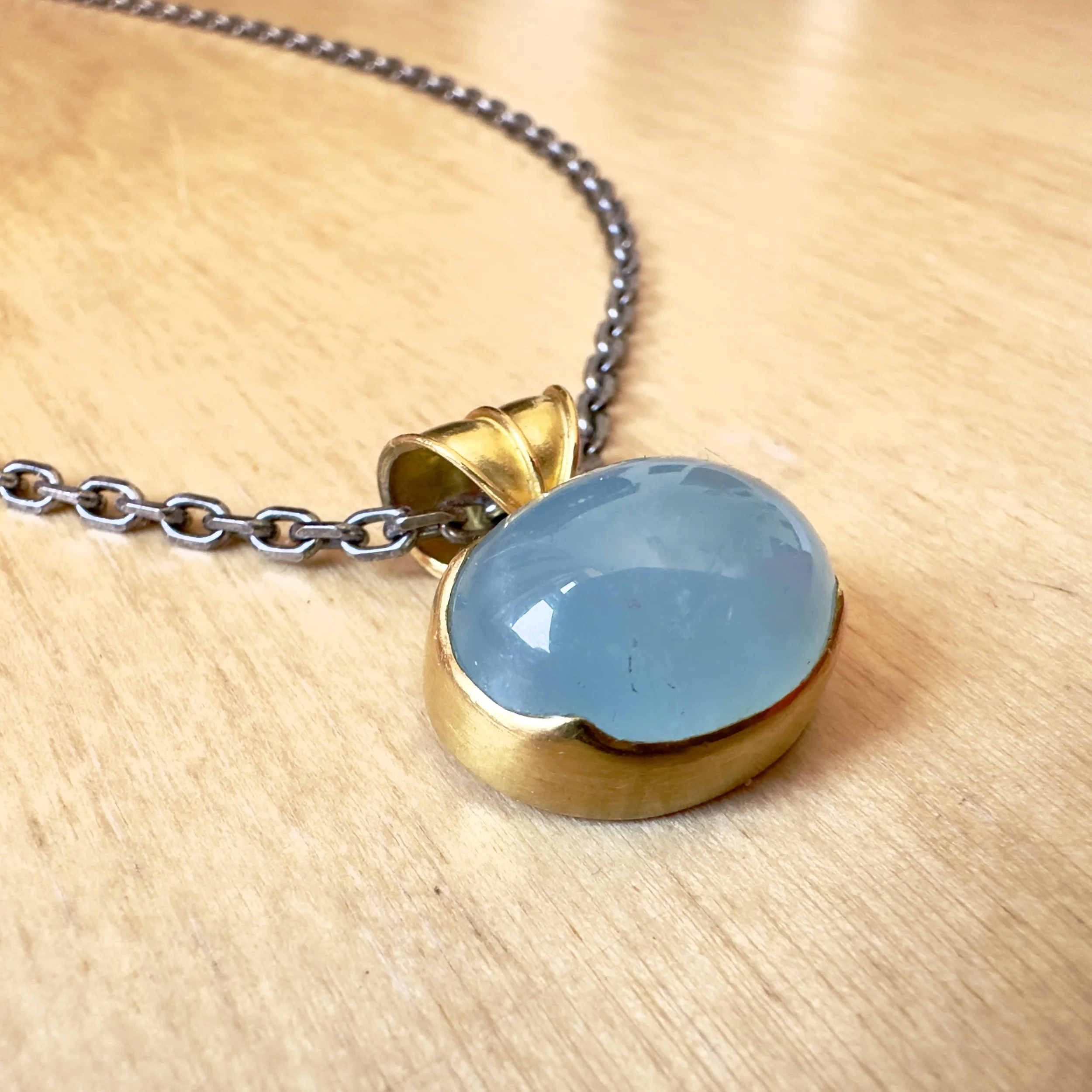 Aquamarine is my birthstone, and I’d been wanting to work with it for years before I finally took the plunge. This pendant was a technical education—a classic Roman-style setting and bail work, ardently pursued. The Romans called this stone aqua marina, water of the sea, and wore it for courage and safe passage through uncertain waters. That felt right as I fell deeply in love with goldsmithing. Its pale, milky blue has the quality of sea glass worn smooth by centuries of tide — quiet, ancient, a little mysterious. Set in 22k gold with subtle pointed details and a repousse bail. Aquamarine is also the stone of clarity and foresight—it may help you see what’s true. If you’re in the middle of a brave chapter, this one’s for you.