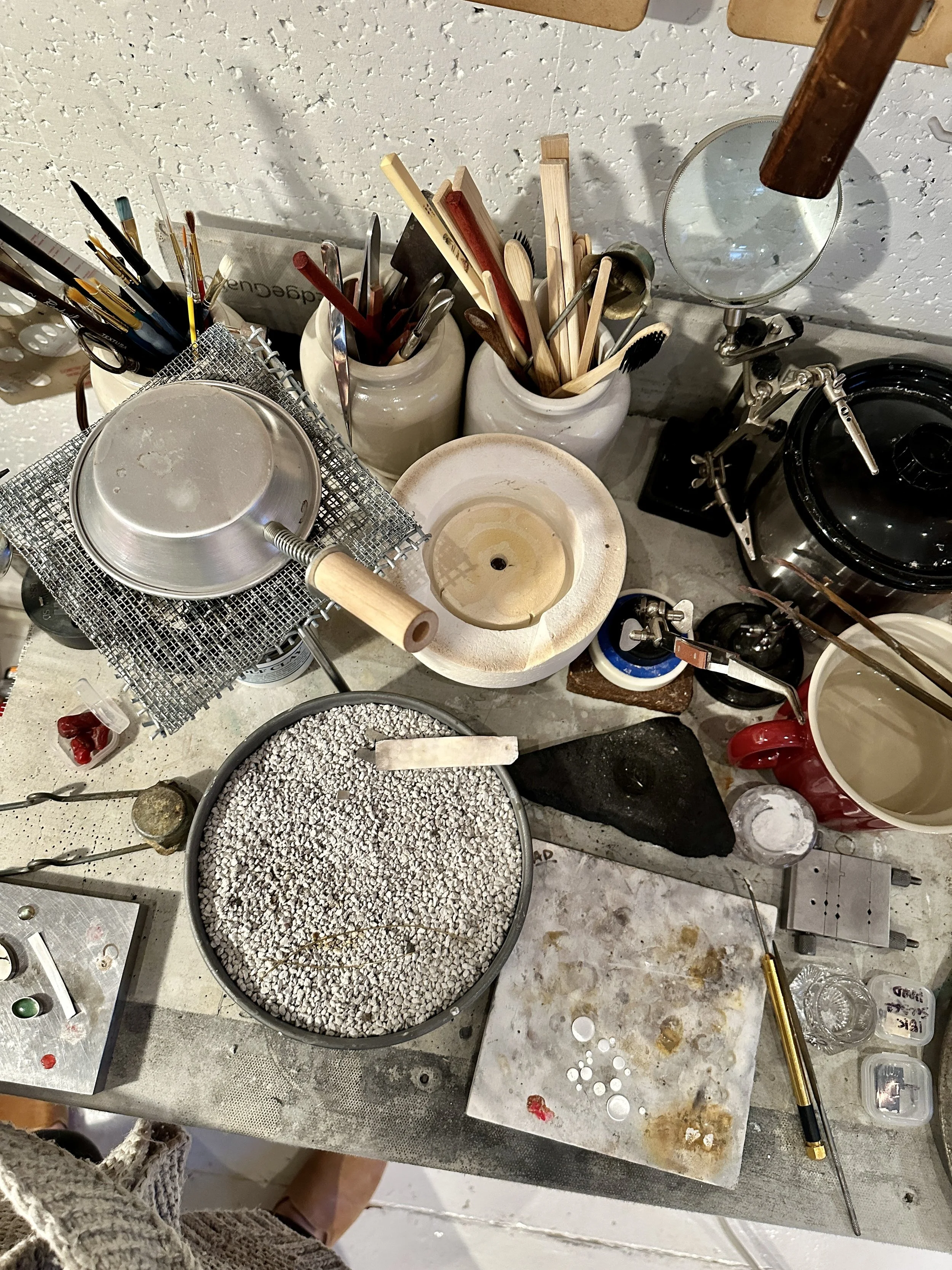 I fabricate every piece I design by hand, in my studio. Picture a hunched over, Medieval tunic-wearing, bleary eyed misanthrope milling, forging and tinkering away. Just kidding I do wear pants. It's just me and my tools bringing each design to life. Occasionally, I collaborate with trusted artisans in New York City for casting an element or bead-stringing (and a social life), but the heart of every piece is crafted in my own creative space, jamming out to 70s Brit Prog rock and maximizing my potential with every podcast under the sun.