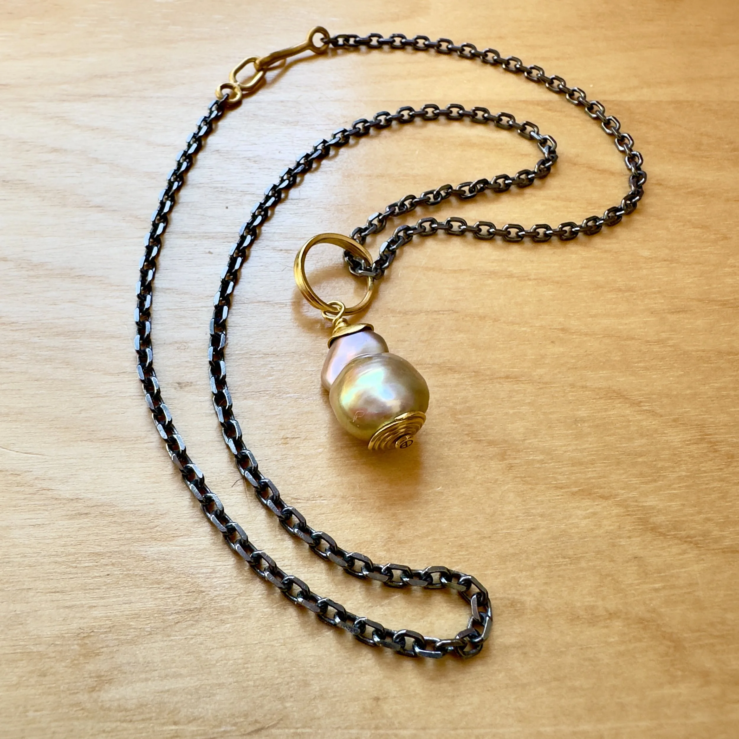 I try to wear traditional pearl strands but their symmetry and perfection never quite match my insides. And yet here we are: This pearl stopped me—irregular, iridescent, kind of a punk rock pearl. It’s actually called a “fireball”. That’s the thing about the loving baroques: the imperfection is the point. An oyster spent years wrapping an irritant in luminous layers of nacre, and what emerged was this thoroughly unique, human torso of a precious object that looks positively Rubenesque. The ancients believed pearls embodied wisdom and protection, which tracks—something this extraordinarily beautiful had to fight to exist. Hand pulled 22k wire wrapped as a little maze of gold at the bottom cradles this pendant in all its glory.