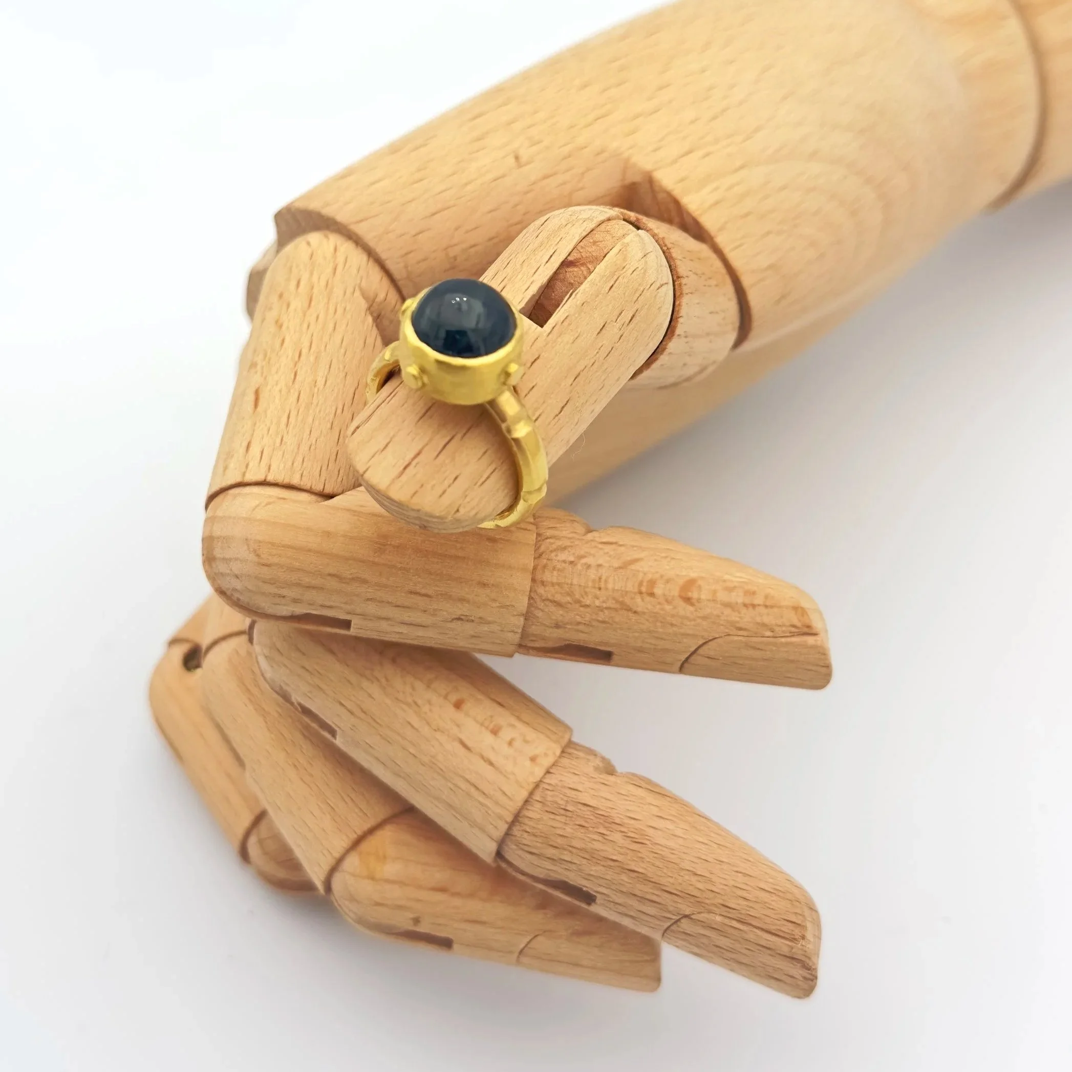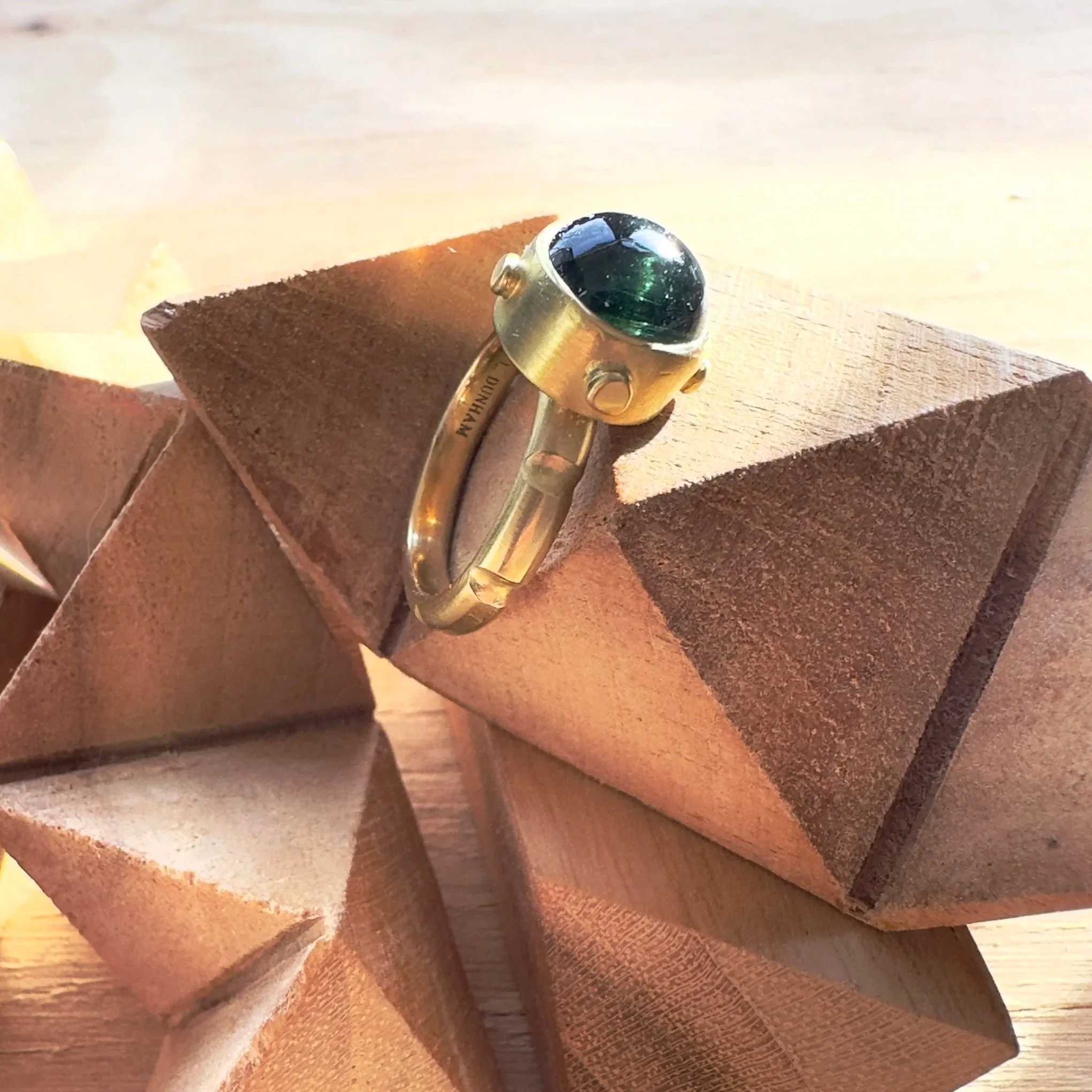 A deep glowing, luminous oceanic Tourmaline gum ball, set in a gorgeous. heavy 22k gold crown. When you find a Tourmaline with chatoyancy—that mesmerizing cat’s eye effect caused by parallel rutile inclusions inside the stone that catch the light—you’ve entered a more rarified territory that commands attention. As the ring moves, so winks the cat within. In metaphysical circles, it’s the stone of the heart chakra, promoting vitality and compassion while the cat’s eye amplifies protective qualities, acting as an all-seeing guardian against negative energy. There’s also the notion that those rutile inclusions act like tiny antennas, conducting and focusing healing energy more precisely—a poetic, if scientifically unproven delight. For the less esoteric of you, this is just one baller little beauty of a ring.