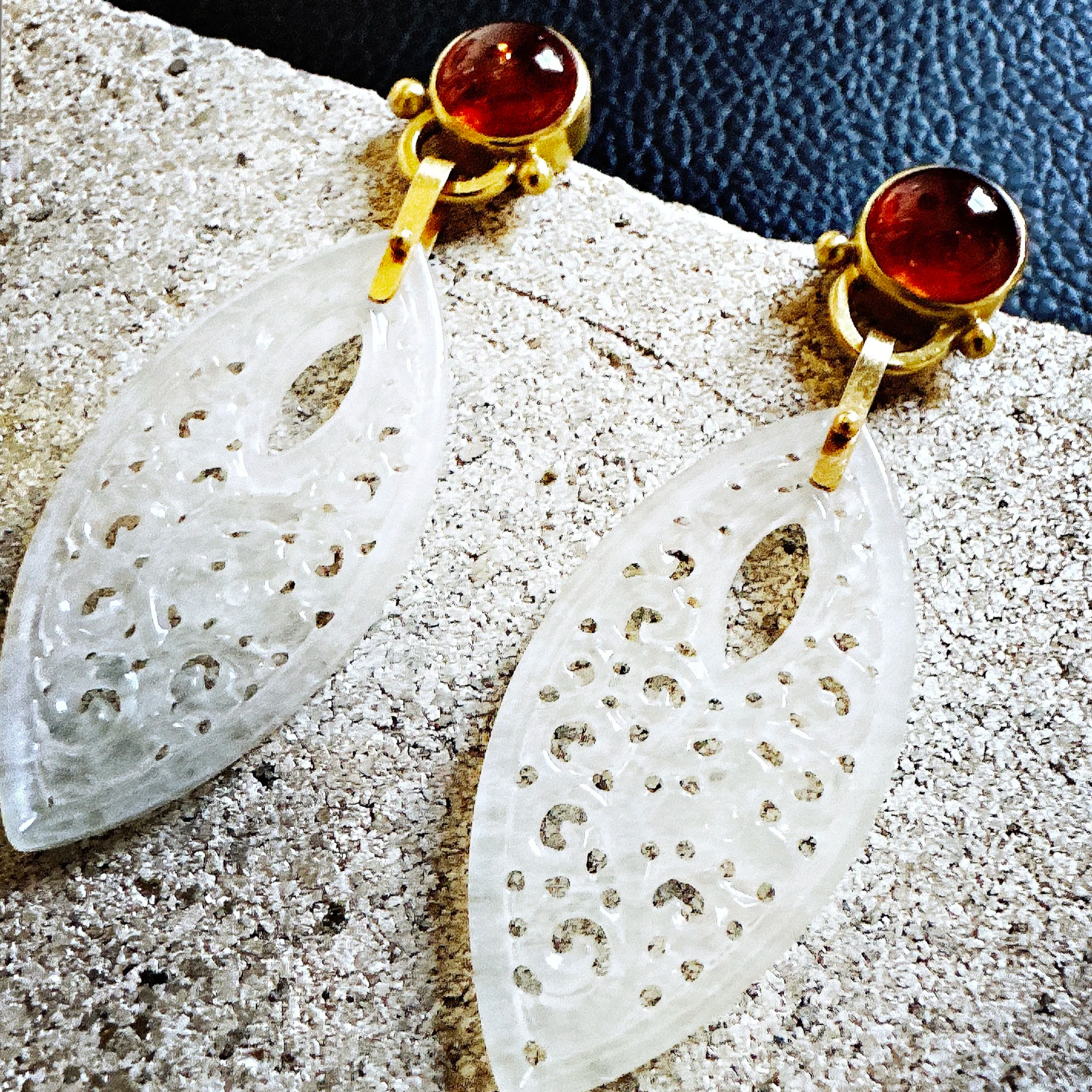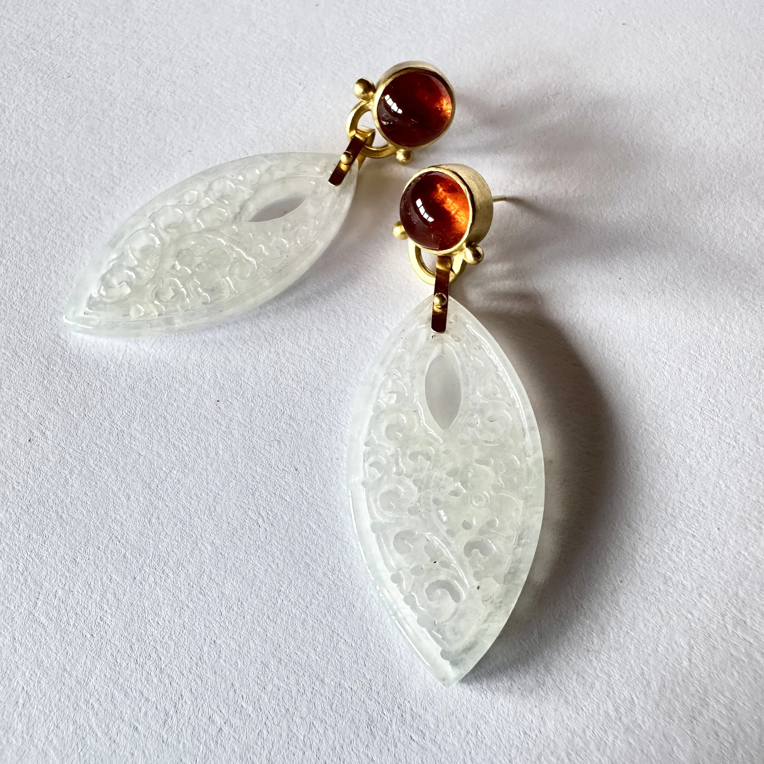 Horsebit, hippie, groovy cocktail madness. Frosty opaque, hand-carved (not by me, thank GOD) jadeite, powerful and exotic, meets the luminous glow of Mandarin garnet set in thick rich gold. These luxurious beauties dangle gently from your lobes, the sway of the jade moves as you tilt your head back with a smile. Absolutely stunning topic of conversation at your next key party.